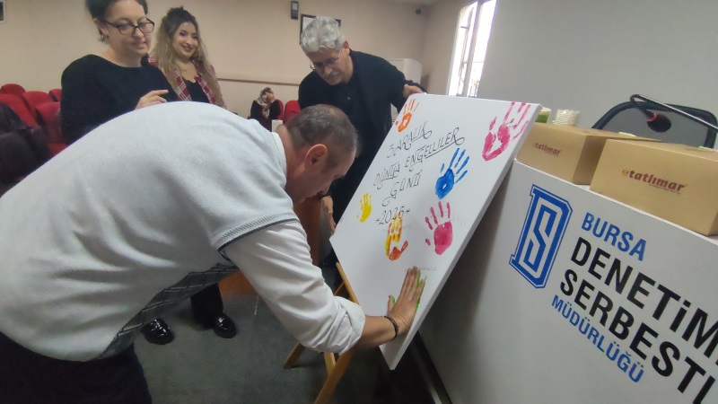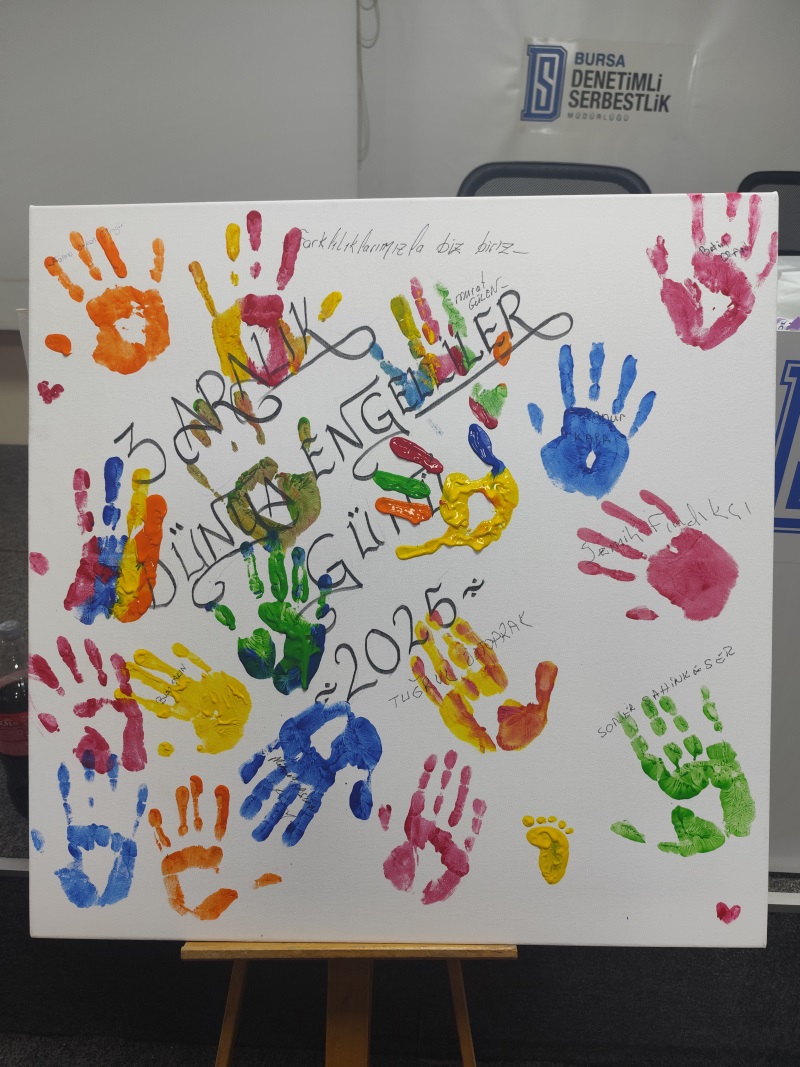 3 Aralık Dünya Engelliler Günü münasebetiyle Bursa Denetimli Serbestlik Müdürlüğü’nde engelli personele yönelik özel bir program düzenlendi. Kurumda görev yapan engelli personellerin katılımıyla gerçekleştirilen etkinlikte, engelliliğe dikkat çekmek ve farkındalık oluşturmak amacıyla el baskısı çalışması yapıldı. Hazırlanan eser, tüm katılımcıların desteğiyle renkli görüntülere sahne oldu.