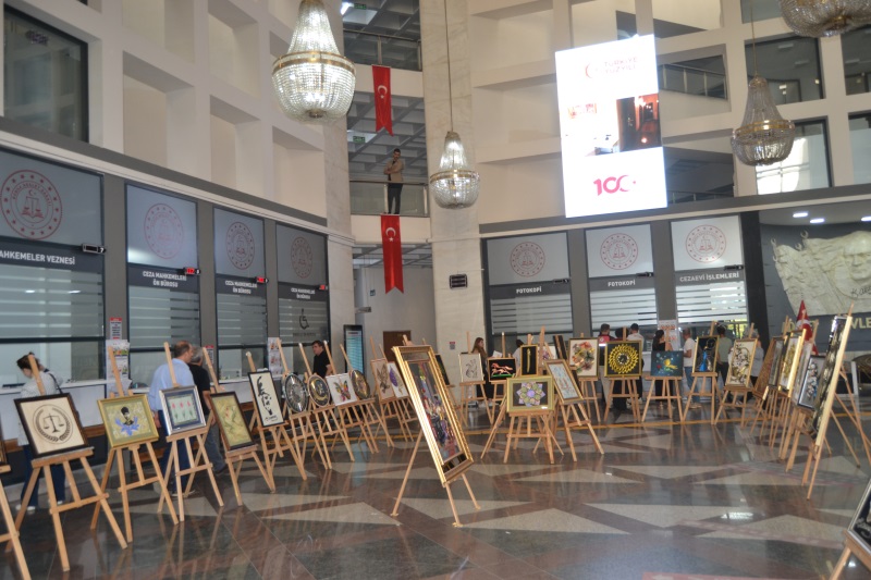 Bursa Adalet Sarayı’nda açılan sergiye Bursa Valisi Erol Ayyıldız, Bursa Cumhuriyet Başsavcısı Ramazan SOLMAZ, Bursa Adli Yargı Adalet Komisyon Başkanı, Bursa Bölge Adliye Mahkemesi Başkanı ve Cumhuriyet Başsavcısı Bursa Bölge İdare Mahkemesi Başkanı Bursa Denetimli Serbestlik Müdürü Cihat ÇANAK, Osmangazi İlçe Milli Eğitim Müdürü Metin Sezer, Osmangazi Halk Eğitim Merkezi Müdürü Zeynep TERECE ve İl Protokolünün katılımı ile açılan sergide yükümlülerin ve kurum personelinin yaptığı 76 eser sergide yer aldı.